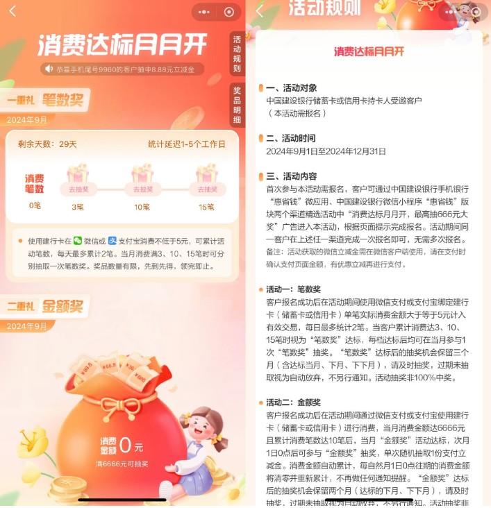 建行消费达标月月开抽立减金