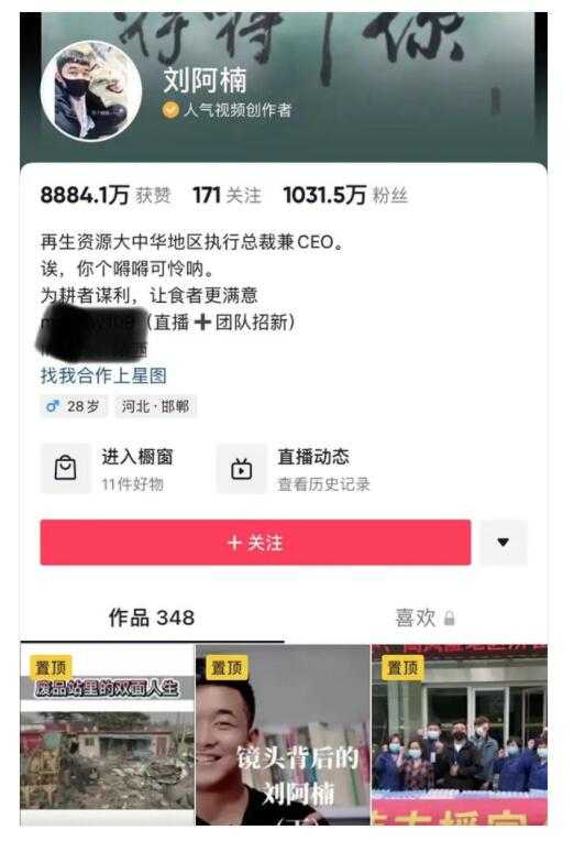 他主做大型建材的回收,对接各种工厂,工程,借助互联网的营销思维,再结合他90后励志青年的人设,现在混的风生水起,回头客特别多。有人做过统计,他们年收入在60w上下,我觉得这是保守的说法,像上边第一位千万粉丝级别,光接广告都不只60w,更何况还有其他业务收入,大家有时间可以看一下他们的视频。他们视频展现的形式都是分享和粉丝交易的过程,非常接地气,真实不做作,能拉近距离感。