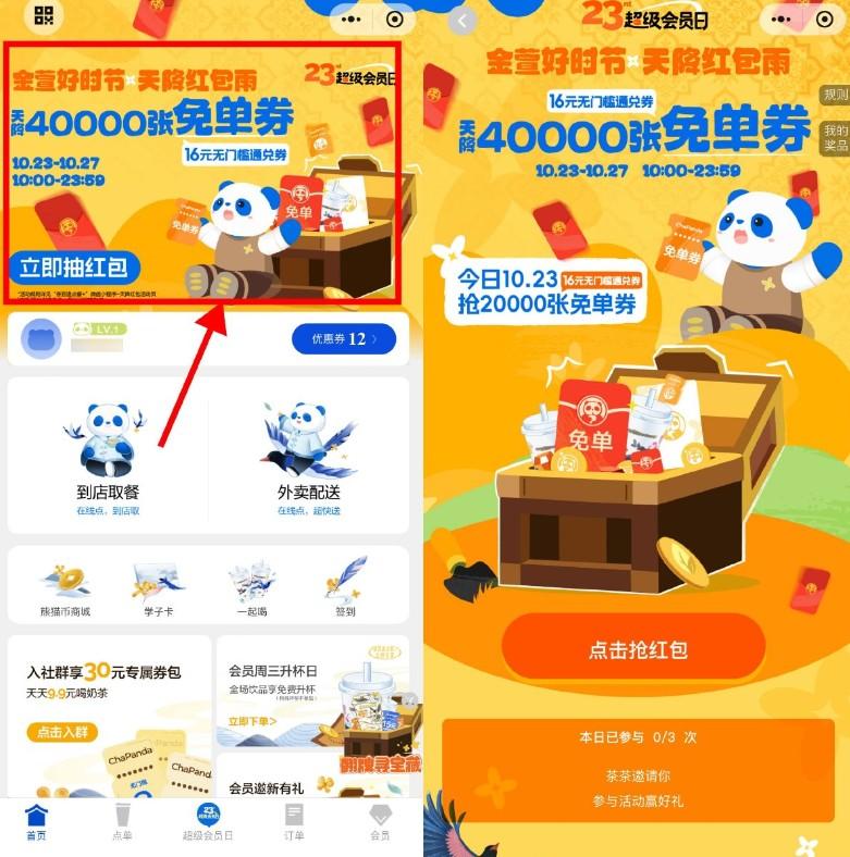 茶百道天降红包膨胀得免单券