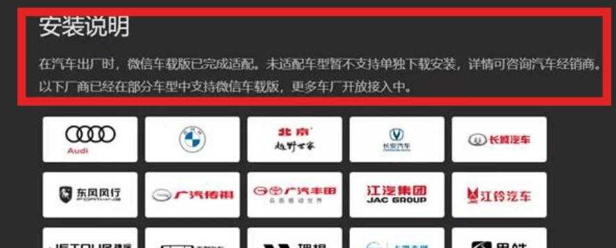 据微信官网显示,微信车载版目前已经接入了 15 家汽车厂商:奥迪、宝马、北京、长安、长城、东风风行、广汽传祺、广汽丰田、江汽集团、江铃汽车、捷途、吉利、理想、上海大通、思皓。给有需要的朋友,如有侵权联系删除。