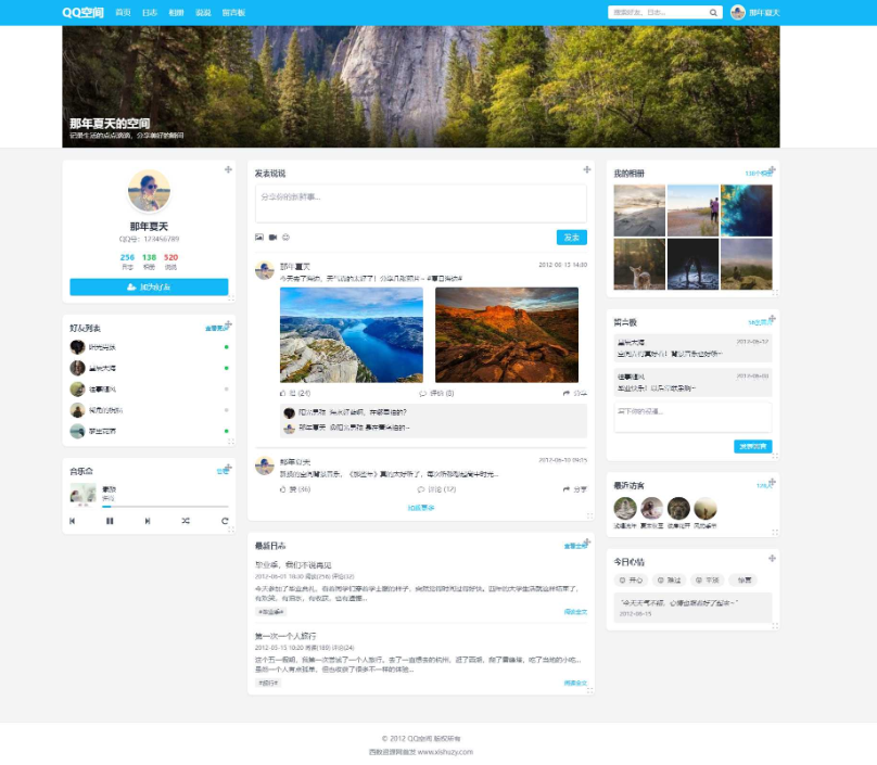 时代感内容:页面中的说说、日志、相册等内容都围绕 2012 年左右的流行元素和表达方式,如 "那年夏天"、"毕业季" 等主题,唤起用户的回忆。