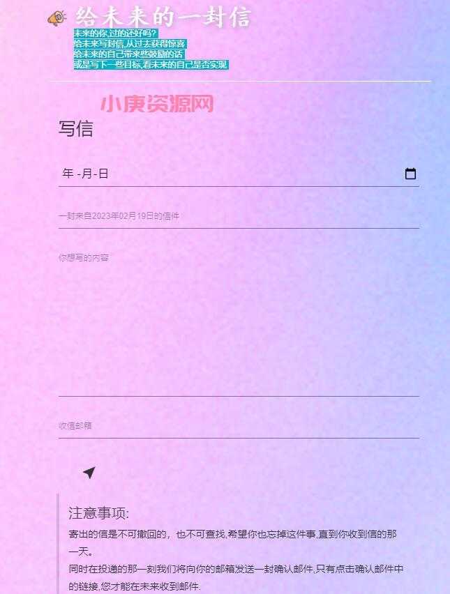 给未来写封信开源源码,本源码支持用户给未来某个人发送一封信。前端采用MDUI框架后端对于定时发信采用screen+php的方式,未来将会增加其稳定性,寄出的信是可以在数据库查询的 支持在根目录的submit.php设置用户多久可以发送一次,用户投递的那一刻平台将向他的邮箱发送一封确认邮件,只有点击确认邮件中的链接,才能在未来收到邮件,写下一段话,期待未来的自己能够有所成就, 或是将自己难以忘记的事情封存于此,半年, 一年, 五年, 当你再次打开封存已久的信封, 阅读当初写下的字句, 你会产生多少共鸣?