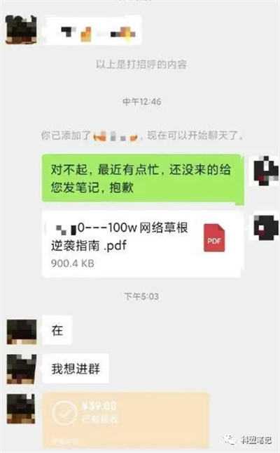 粉丝数1000以下最好不要有任何营销动作。粉丝1000后,号成功。然后在粉丝群里留下联系方式,引至微信。基本上就是发个东西,让别人加你微信。加了之后,你发的基本都是一些思维类的东西。然后在文件里说:我有一个付费社区,收费39.9元。每天分享什么,获取一些分享案例等等。分享信息很好找,某宝每天晚上都能买到低价的分享信息。