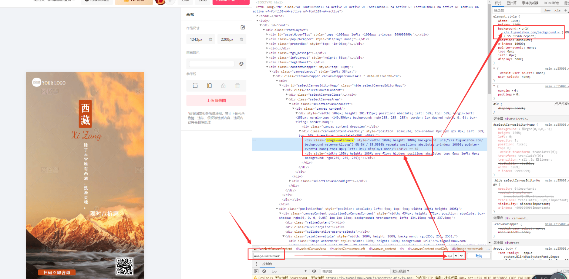 快了快了, 马上就可以成功了, 在这个页面,右侧红色框的是标签的属性 有高、宽等等, 这儿会发现一个很长的 background: url(//s.tuguaishou.com/background_watermark1.svg) 0% 0% / 79.6813% repeat; 这个表示背景图, 我们把他取消即可,如下图: