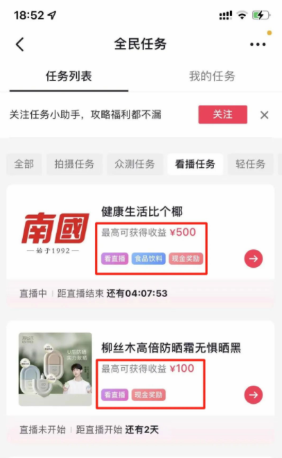 每一个看直播的任务都会有必须完成的要求,在做任务之前记得把要求看清楚,达到要求才会有深收益,