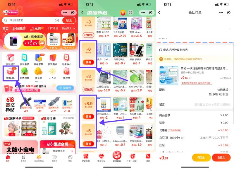 点击“微信-发现-购物”进入->点“9.9包邮”进入后点底部“微信补贴”->下拉有几个满减券,领取后点“去使用”筛选一下价格,挺多1元包邮的实物