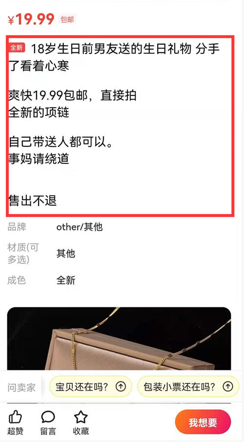 闲鱼用户本身是来淘二手便宜商品的,我这边以分手为理由进行转售,符合了二手的定义,还有个细节就是我标注了,是跟前任分手了,很伤心,但商品是全新未拆封包邮转售的。