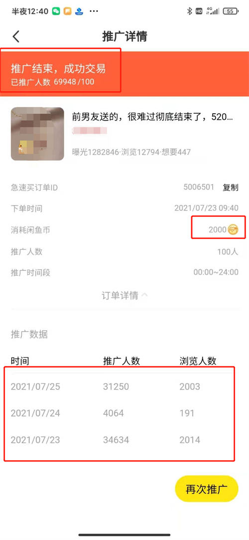 仅支付了2000的闲鱼币去推广,数据还是很不错的。这个功能每天只能推广一个商品,所以且用且珍惜,尽量用在能成为爆款的商品,能发挥这个功能的最大作用。