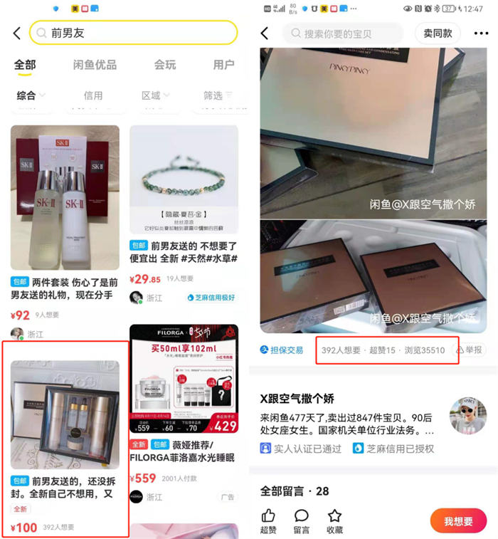 首先从平台逻辑做了个分析,闲鱼是个二手平台。既然闲鱼是个二手平台,按理说闲鱼用户都是想上闲鱼买便宜货的。事实上确实,闲鱼用户对于价格是挺敏感的。但不做高单价,不代表不能做高利润的商品。通过这个思路,我挖掘了一个关键词“前男友礼物”