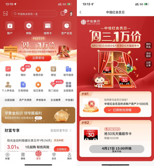 ->只需中信咔里有1000亓就有抢购资格,提早转入就有资格了!