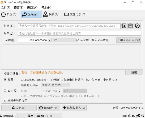 3. 打开Bitcoin Core钱包,在文件-恢复钱包,导入dat文件,等网络同步后,就能看到余额150BTC,仅装逼用,千万别忽悠人。 备注,如果是新手,狗总不建议你去dat交易网站去买老钱包,因为鉴别真假需要点专业知识,不然1个亿也太好赚了。曾经一度有人专门制作假dat卖给小白。 而且即便是真的,在使用解密工具的情况下,毫无线索的密码,理论上1台顶配电脑,要跑1千亿年才能解密。不过,如果是自己的老dat,记得一些关键词,可能几天就能破解了
