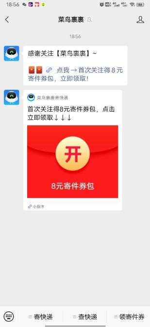 微信关注菜鸟裹裹免费领取上门取件红包