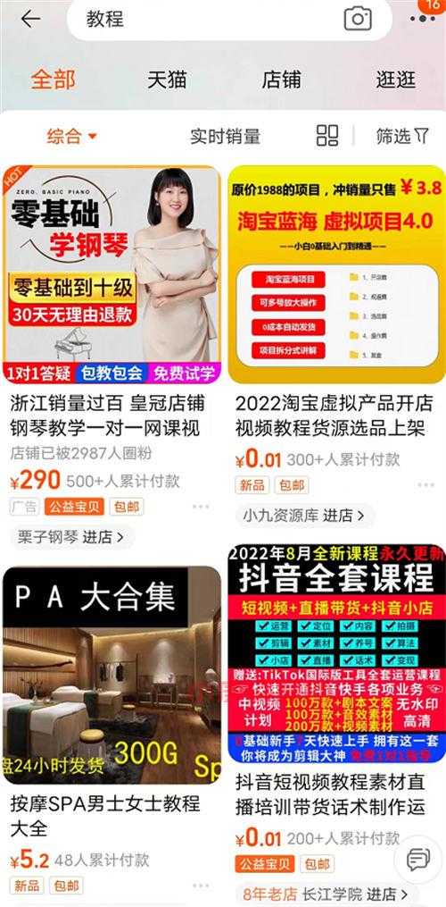 再来看看,很多人在变现的,在淘宝搜索关键词“教程”,能发现很多值得做的领域。