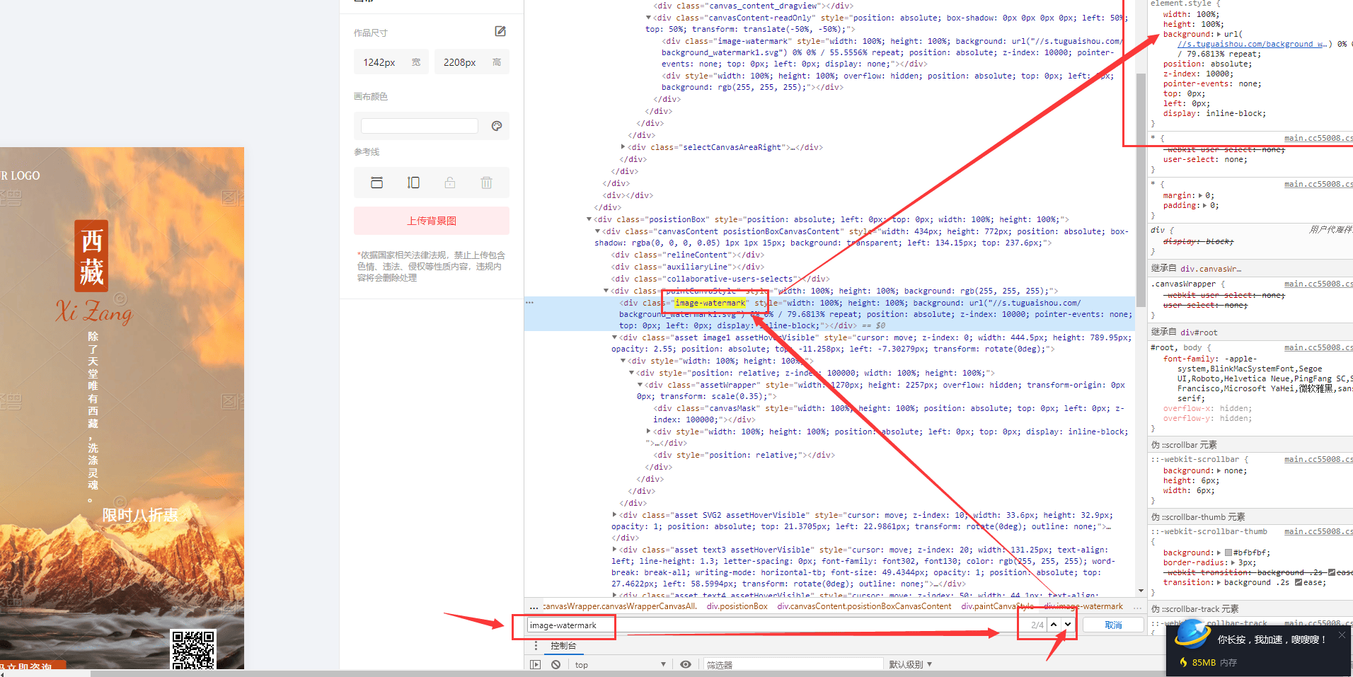 快了快了, 马上就可以成功了, 在这个页面,右侧红色框的是标签的属性 有高、宽等等, 这儿会发现一个很长的 background: url(//s.tuguaishou.com/background_watermark1.svg) 0% 0% / 79.6813% repeat; 这个表示背景图, 我们把他取消即可,如下图:
