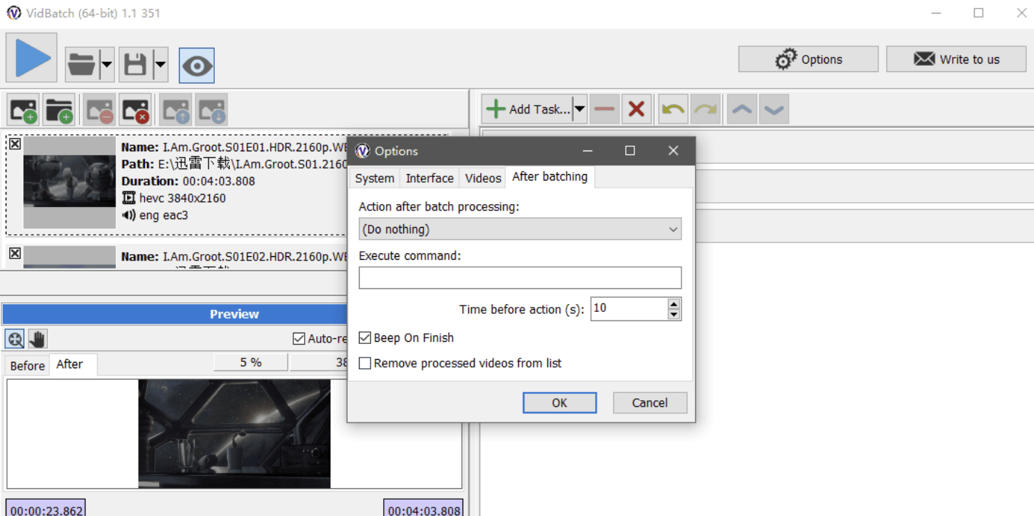 VidBatch 是一款免费的批量视频处理工具。首先,将需要的视频文件添加到处理列表中,然后添加任务,调整参数并一次处理一堆视频文件。