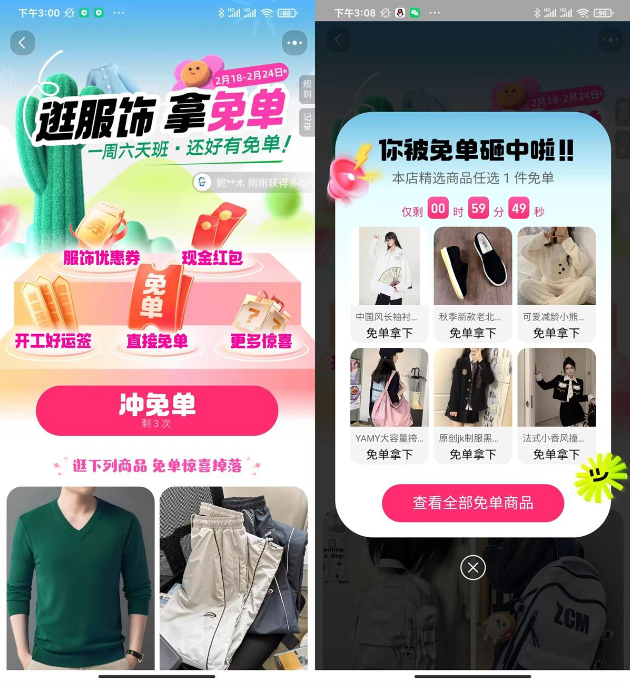 淘宝服饰每天3次机会抽免单