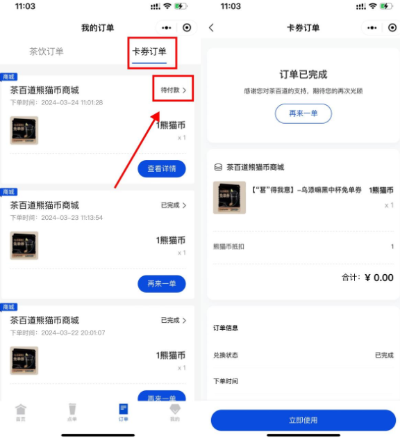 微信进入小程序“茶百道点餐+”->先去简单订阅得5个熊猫币->11点整1个熊猫币兑换乌漆嘛黑免单券,每天限量10万份