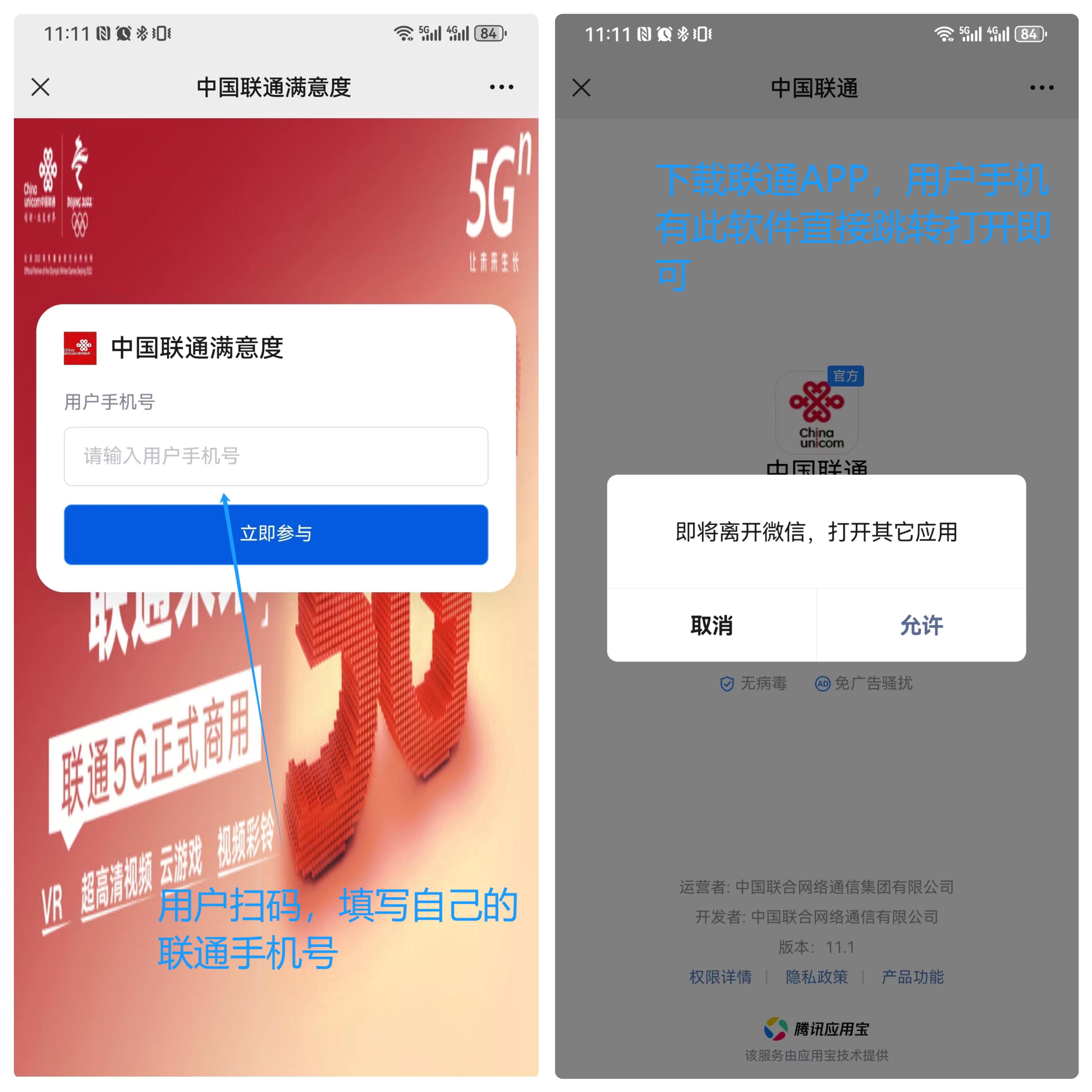 扫码后填写联通手机号点击立即参与(填写手机号与做单手机号一致),弹出跳转【中国联通】APP页面,用户下载即可(之前有APP的用户可直接跳转)。