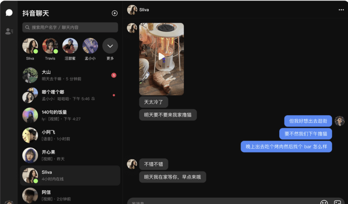 总体来看,“抖音聊天”的界面比较简单,整体布局类似微信电脑版,最左侧一览是聊天和好友列表界面切换按键,
